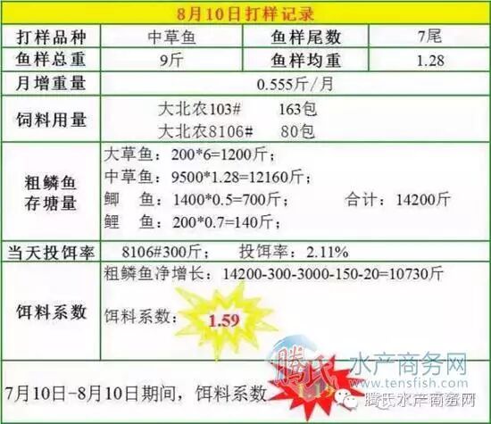 通过技术员的耐心分析,罗老板开始意识到自己“吊着喂”的投喂思路会引发三大风险:第一,低水平投喂可能会造成饵料系数偏高;第二,好鱼价不等人,等鱼价好时再拉规格可能会错过好的市场行情,应该是鱼等价,而不是价等鱼;第三,今年草鱼放养密度降低以及老口草鱼放养比例较大,后期规格小的草鱼难有市场。经过一番思想斗争,罗老板听从技术员的建议,从7月10日开始使用膨化料8106和颗粒料103(2:1)混合投喂,并提高投喂率。