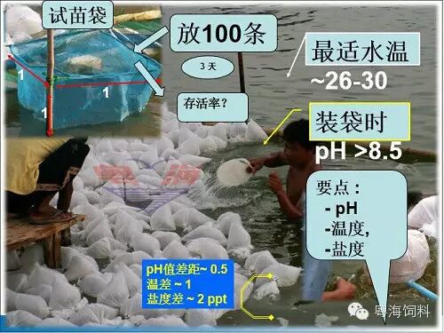 有少数养殖户可能对试水存在误解。说白了,试水就是试我们养殖塘的水质,而主要不是试种苗的优劣。所以我们在取水试验时尽可能地取养殖塘中水质最差的塘水来试。;如果是挂网试水,尽可能把网兜挂在塘中远离氧机位置。