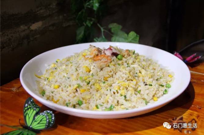 讲真,小编还是第一次见这么大盘的炒饭!就连旁边的小蝴蝶都被挤出镜了,可想而知这是多大的盘子。亲测好吃!米饭颗粒分明,青豆和鸡蛋分布均匀,虾仁超大!