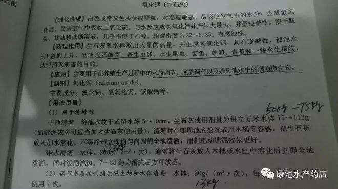 3.杀菌。上个图片写到生石灰的药理作用,遇水释放大量的热,生成氢氧化钙具有强碱性,可以迅速杀死细菌,寄生虫卵,害鱼,青苔等。