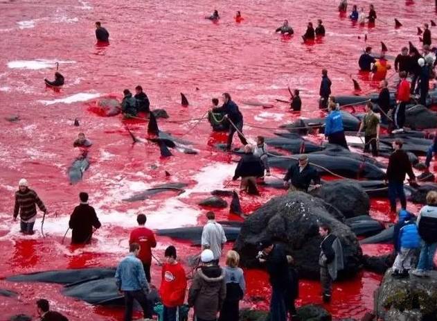 整片海水都被血水染红了……鲨鱼群、鲸群和海豚群(鲸鱼、海豚不属于鱼类,但命运是一样的)等被包围并赶到浅滩区域,,其中的年幼的一些得以幸免,却被卖到了水族馆囚禁起来为人类表演……