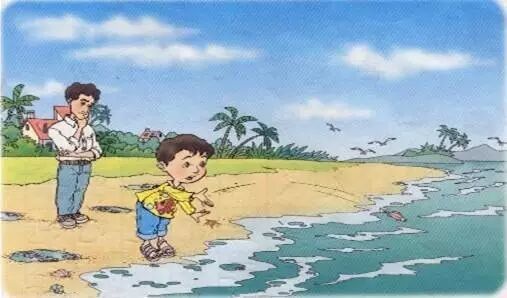 “这条小鱼在乎!”男孩儿一边回答,一边捡起一条鱼扔还大海。