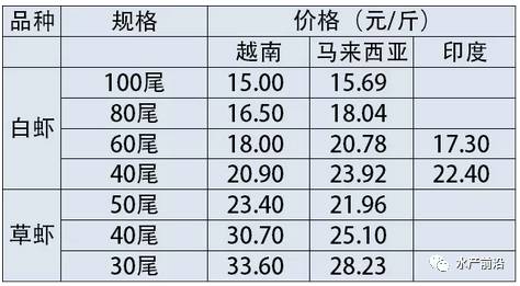 本周(10月18日-10月24日),越南白虾和马来西亚白虾在本周价格保持稳健的上涨,平均每公斤上涨幅度达到0.2元。100尾/公斤规格的价格目前在15元/斤左右,80尾/公斤的价格在16.5元/斤,40尾/公斤的价格在20.9元/斤。印度的白虾价格保持在一个相对稳定的水平。