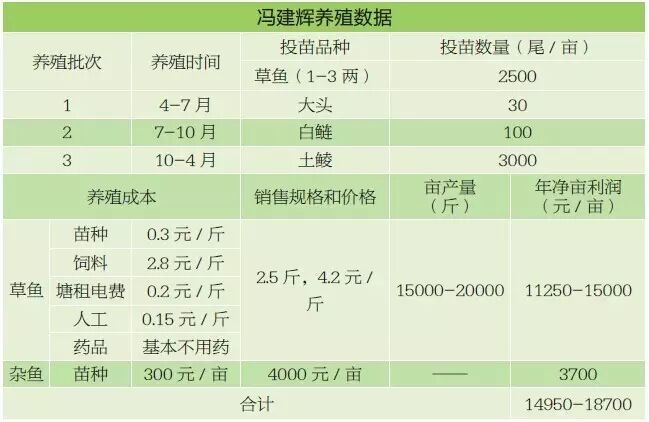 “我去年下半年才开始尝试精养草鱼,拿了30亩塘出来试养,当时8月份投苗,11月中旬捉鱼,平均规格2.5斤/尾左右,鱼只出了一批还没出完,亩产就已经达到5000斤。”冯建辉介绍。冯建辉的投苗品种搭配是:草鱼2500尾/亩(1~3两)、大头鱼30尾/亩、白鲢100尾/亩、土鲮3000尾/亩。一年可以养殖三批鱼:第一批是4月投苗养至7月出鱼,第二批7月至10月,第三批10月至次年3、4月份。其实第三批鱼到1月份已经可以达到上市规格,在1~3月期间可以根据价格行情灵活选择上市时间,冯建辉分析,在3~4月份之间上市效益最为可观,因为这正是青黄不接的时候,鱼少,价格也好。他计算过该模式草鱼的养殖成本,大概3.5元/斤左右,即使是以现在4.2元/斤的低价出售,也能有得赚,更别说还有其他杂鱼的销售收益。“跟其他养殖户比,我的饲料、药品、苗种、流通都是自己的,就更有优势,基本可以比别人省0.5元/斤的成本,年亩净利润上万元不是问题。”冯建辉说。
