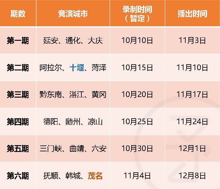 许多人在茂名成功晋级复赛后,仍然持续关注茂名的竞演情况,现在,茂名竞演录制及播出时间终于确定,也让茂名人开始了新一轮的期待。18座晋级复赛的城市,目前均已进入复赛筹备阶段,将在六轮复赛中,争夺十强城市的名额。届时,又将是一场场精彩纷呈的视觉盛宴。