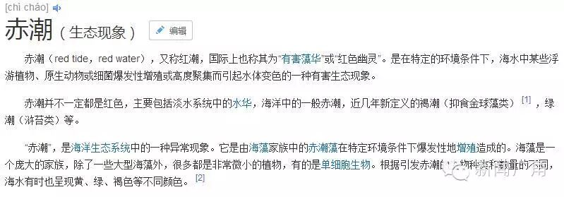 赤潮(又称红潮)是在特定环境下,海洋中浮游生物(主要是藻类)暴发性繁殖引起的一种有害生态异常现象。赤潮发生时,某些生物分泌的赤潮毒素可能污染鱼、贝类等生物,人进食后,可能发生神经系统麻痹、胃肠道紊乱、记忆丧失等食物中毒症状,甚至导致疾病流行和传播。