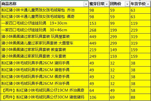 大小宝宝们都喜爱的超级飞侠,贴心的为大家准备了单个装和套装,价格比聚划算都低。,小猪佩奇既有玩偶也有玩具,特意为小宝宝挑选了B.toys软积木和回力车,专为1岁内小宝准备。大脸猫琴是镇牌之宝,一定得有,波普串珠是大一点女宝宝的最爱,兔头能穿一天不嫌腻……最后是还有人气明星小猪佩奇,玩偶和玩具都有,价格美死!