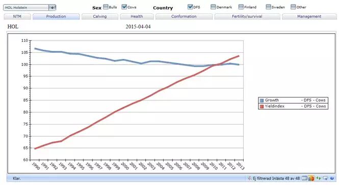 图4. 北欧育种体系中奶产量与生长指数的历史变化曲线