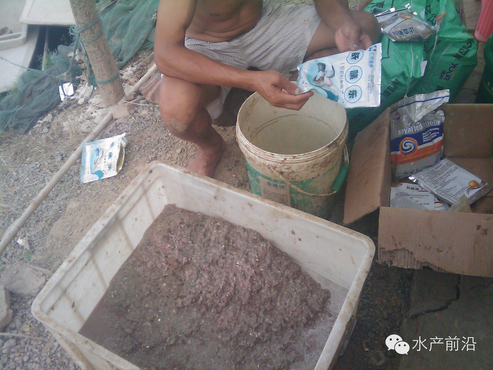 第四步:“浸料”与投喂(见图6)。“浸料”是指饲料拌好后,要等个20分钟左右再投喂,这样做的目的是让饲料吸收一些鱼浆中的“水分”,促使饲料软化,可以减少黄鳝肠炎病的发生概率。