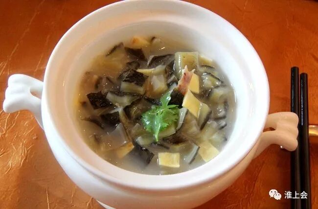 此菜选用地产野生甲鱼,配以水发干贝等原料精心烹制而成,以其肉质鲜嫩、汤鲜味醇、香气四溢而独具特色;食后具有调理五脏、安定神经、去除体内湿气、预防四肢浮肿之功效。目前,淮安朱桥甲鱼馆擅烹此菜,并利用甲鱼的不同部位作主料,开发成了甲鱼系列菜肴的宴席。