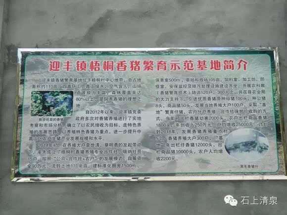 为了发展经济,增加农民收入,2010年,迎丰镇从贵州省从江县引进香猪进行养殖。从江香猪以体形矮小、肉质香嫩、基因纯合、富含微量元素、纯净无污染等独特优点而著称,并具有适应性好、抗病力强、饲养管理粗放等优点。