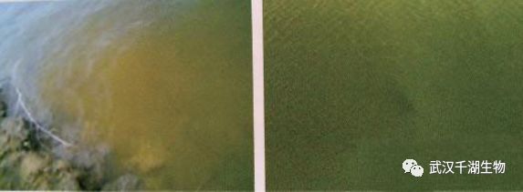 淡绿色(左图)、翠绿色(右图):这种水色的水质看上去嫩爽,透明度在20-35厘米之间,肥度适中,水中的藻类是绿藻,常见的绿藻有小球藻、海藻、衣藻等。绿藻能吸收水中大量的氮肥,净化水质,养殖动物在此环境中生长快,体色透明。长期使用公司的“净水菌”可保持此水色。