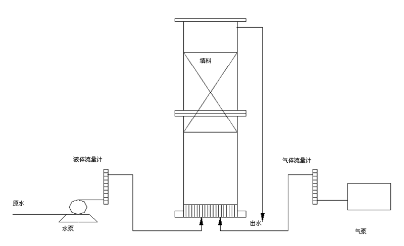 生物处理柱直径400mm,柱内水深4m,填料为聚苯乙烯白色球形,粒径8~10mm,密度0.02 g/m3,填料堆积高度为2m,曝气区高度800mm,滤柱底部设穿孔管曝气系统,孔径2mm,气水同向流。