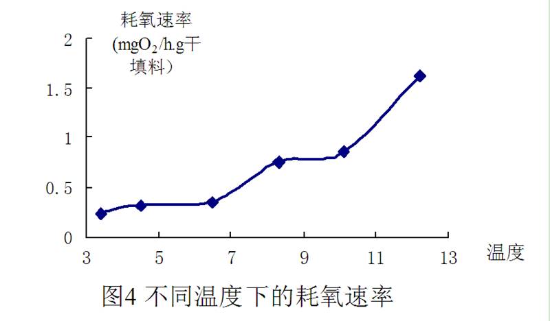 耗氧速率是在相同的环境条件(温度,pH等)下,单位重量的生物膜在单位时间内对溶解氧的消耗量,可以反映生物膜活性的强弱。本试验在其它环境条件相同,不同温度下对装置下层(0.5m处)填料生物膜耗氧速率进行了测定,结果如下图,生物膜耗氧速率随温度的降低而减少,在低温下6.5℃~3.4℃范围内生物膜上微生物对氧的利用率明显降低,并且在这个温度范围内耗氧速率的数值相差不大,为0.24~0.32mgO2/h·g干重填料左右,这说明在低温下生物膜的活性明显减弱。