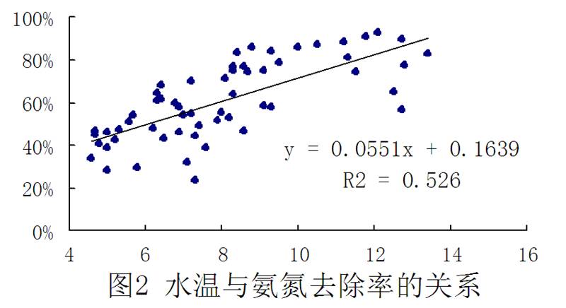 从图2中看出在水温4.6℃~13.4℃范围内,氨氮去除率与水温有线性相关,随着水温的降低,氨氮去除率也逐渐降低。