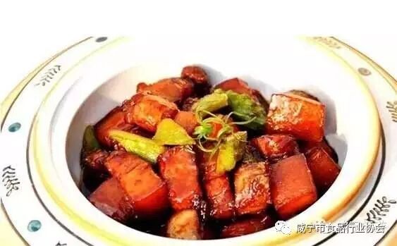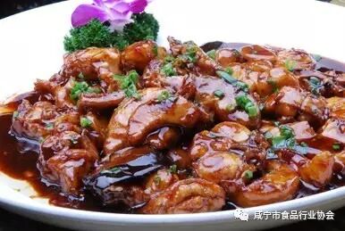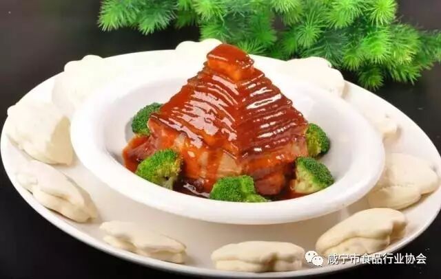 取材于咸宁著名的通城两头乌猪肉,两头乌因首尾黑色,无饲料喂养而得名,其肉质鲜嫩,烹饪时加入当地特制的板酱,微咸中还带点酱香,既开胃又爽口,有暖中、益胃之效。
