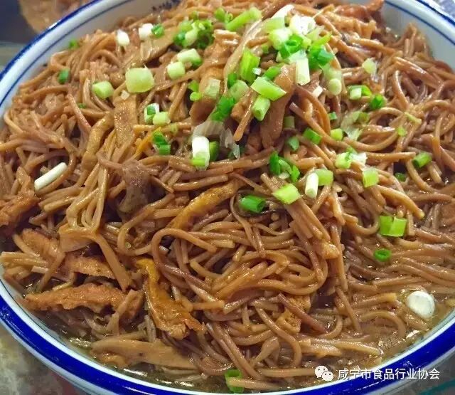 咸宁合菜面是一道独特民间风味,是农村办红白喜事时不能少的一道美食。合菜面的做法:先把面条炒熟,放入适当水量烧开,再加入豆腐泡丝、青菜丝、榨菜丝、肉丝等一起煮,直到面熟就可以食用了。
