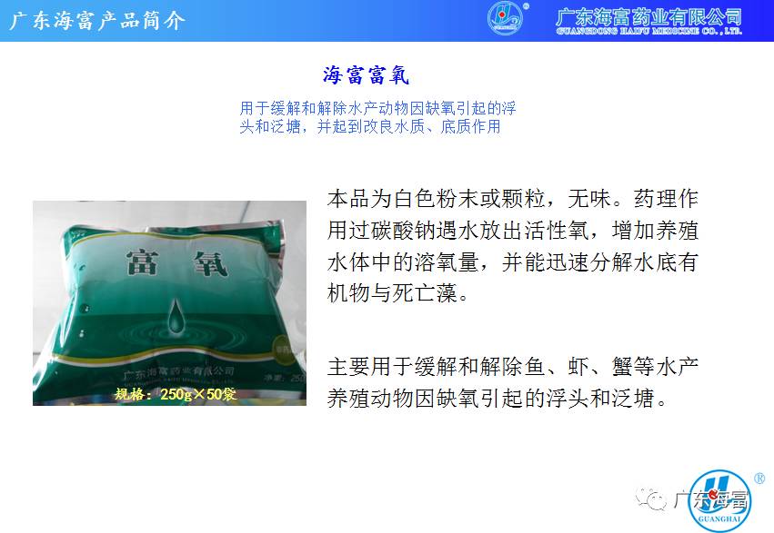 主要用于缓解和解除鱼、虾、蟹等水产养殖动物因缺氧引起的浮头和泛塘。