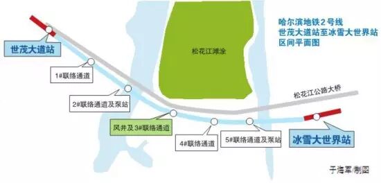 据悉,世茂大道站-冰雪大世界站区间总长度为2911.887米,是目前国内高寒地区在建里程最长的过江盾构区间,盾构隧道采用两台泥水平衡式盾构机施工,区间主要穿越的地层为粉细砂层,局部有粉质粘土夹层,地貌为松花江漫滩区,过江段水面宽分别约130米、410米,水位最深处约6米。江中冲槽地段隧道上方覆土厚度约9.2米。