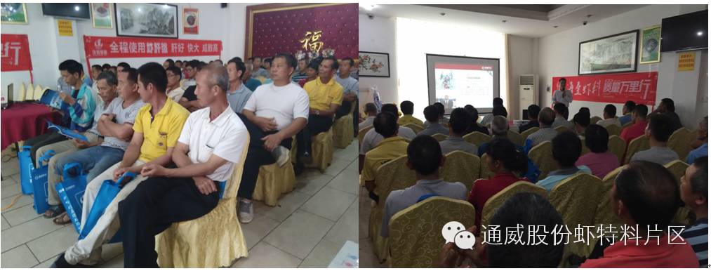 自3月份以来,“通威质量万里行·海壹资产倍增计划论坛”强势登陆珠三角、粤东、海南、广西等地,数场会议均在当地创下多个第一:质量最高、规模最大、效果最好、虾料订料数最多……今天是通威质量万里行之珠海海壹江门荷棠站隆重举行的大好日子。早上,一群南美白对虾养殖户兴高采烈集结在荷棠镇上的新庆楼,目的就是参加由珠海海壹水产饲料有限公司举办的通威质量万里行和虾肝强技术讲座。 虾肝强产品及虾肝强技术于2014年底向全国推广,经历1年多的推广,不但在保肝护肝、促消化、提高免疫力、提高抗应激力等方面的功能尽显无疑,实现提高虾成活率30%等方面已经取得卓越的成效,在全国各地已经受到南美白对虾养殖户热捧:曾见过1口塘全程虾肝强的;曾见过1个养殖户几口塘全部全程使用虾肝强的;曾见过1个围所有养殖户所有的塘全部全程使用虾肝强的;曾见过1条村所有养殖户所有虾塘全部全程使用虾肝强的;今天第一次耳闻目睹了1个镇几乎所有养殖户所有虾塘全部全程使用虾肝强,这就是荷棠镇,真是牛!我相信,很快会出现某1个县或市几乎所有养殖户所有虾塘全部全程使用虾肝强。