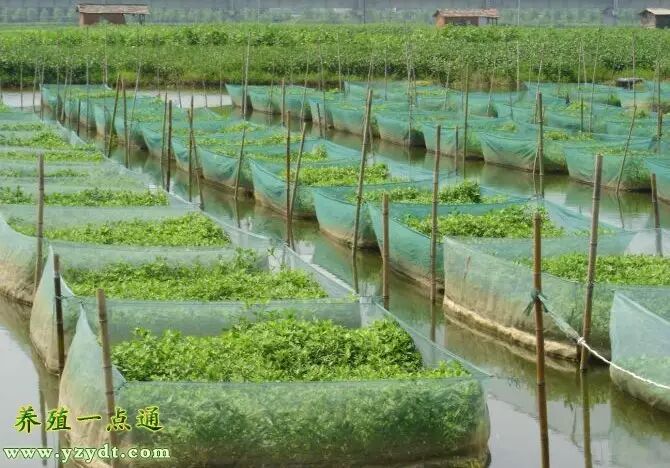 每个网箱面积6~10㎡为宜,网箱高度1.5m,设置网箱的面积不超过池塘养殖水面的40%。网箱布置后,在投放苗种前1~2周将水生植物移植到网箱内,以供黄鳝栖息。水生植物的品种有水花生、水葫芦等,以水花生比较适宜。