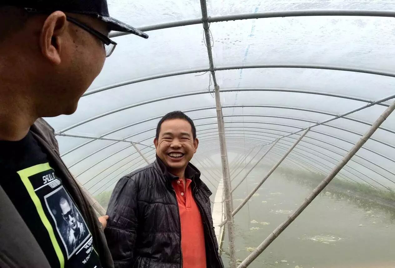 ▲养殖户曹植平(左),全场50张棚全部放普瑞莫虾苗,3月26日投苗、现在100头,情况非常好,正喜悦的向我们介绍养殖情况。