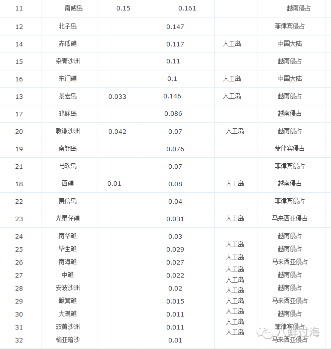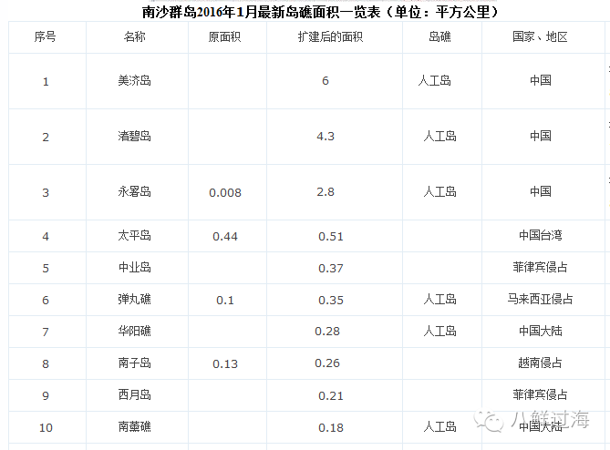 2016年1月新岛礁面积一览表 图片来源:http://blog.sina.com.cn/u/2700980500