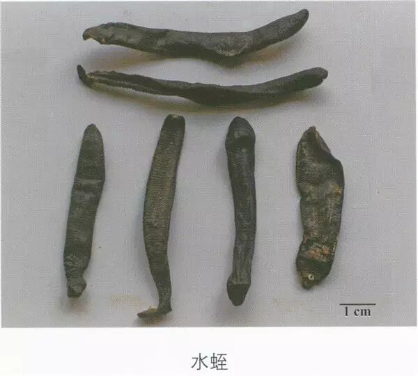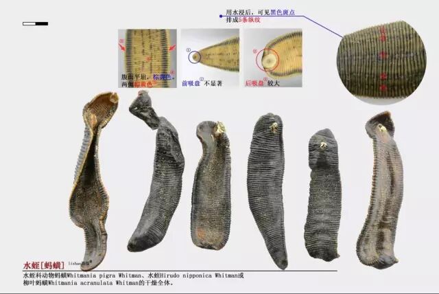 呈扁平纺锤形,有多数环节,长4~10cm,宽0.5~2cm。背部黑褐色或黑棕色,稍隆起,用水浸后,可见黑色斑点排成5条纵纹;腹面平坦,棕黄色。两侧棕黄色,前端略尖,后端钝圆,两端各具1吸盘,前吸盘不显著,后吸盘较大。质脆,易折断,断面胶质状,气微腥。