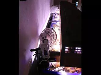 在波多黎各,平均温度有78华氏度,在夏天可以达到98华氏度,鱼缸里面,在金卤灯、各种泵的加热情况下,鱼缸水温能够轻松达到100华氏度,因此我用水冷机把温度控制在80华氏度,用2个小风扇带走灯柜里面的热量。