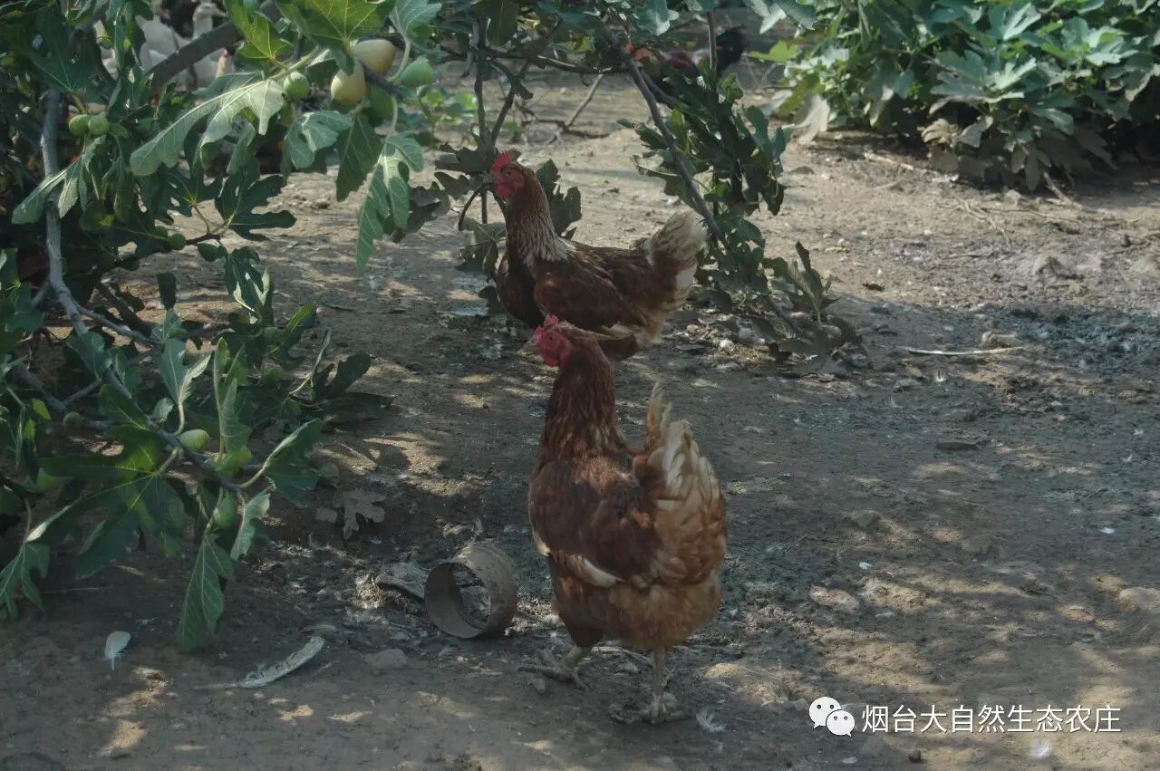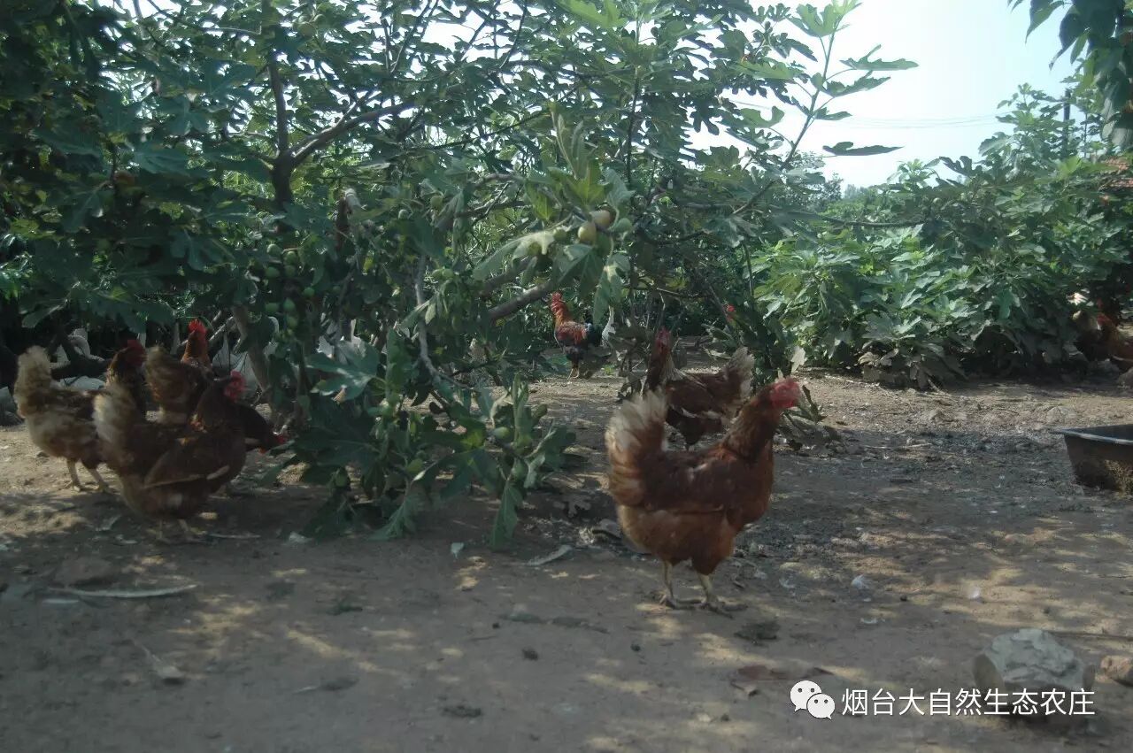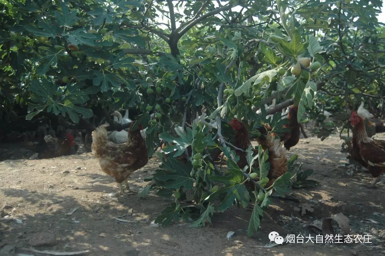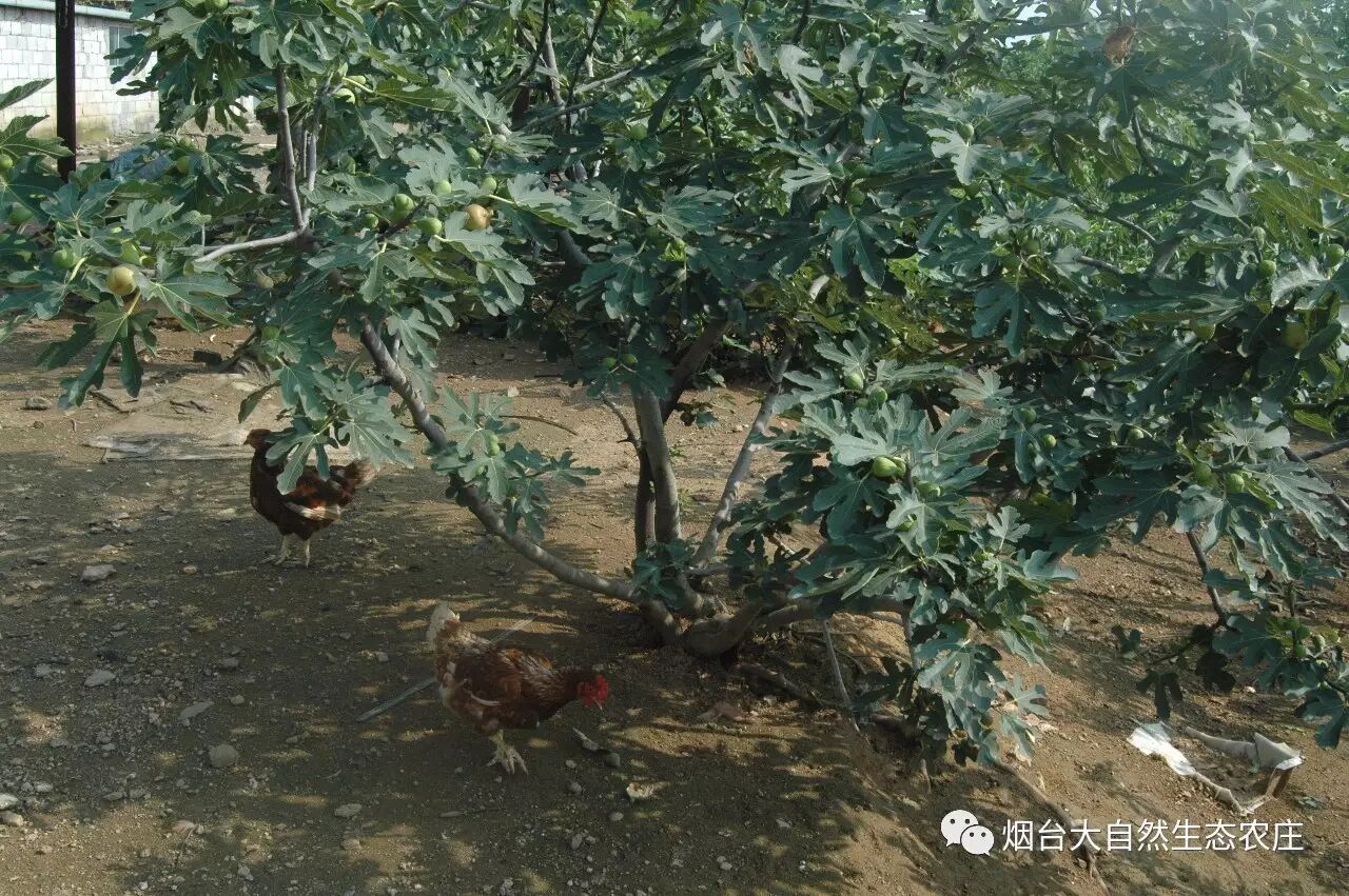 无花果树很多,无花果树很矮,所以鸡们饿了就可以蹦起来啄下一个来吃,自助餐。