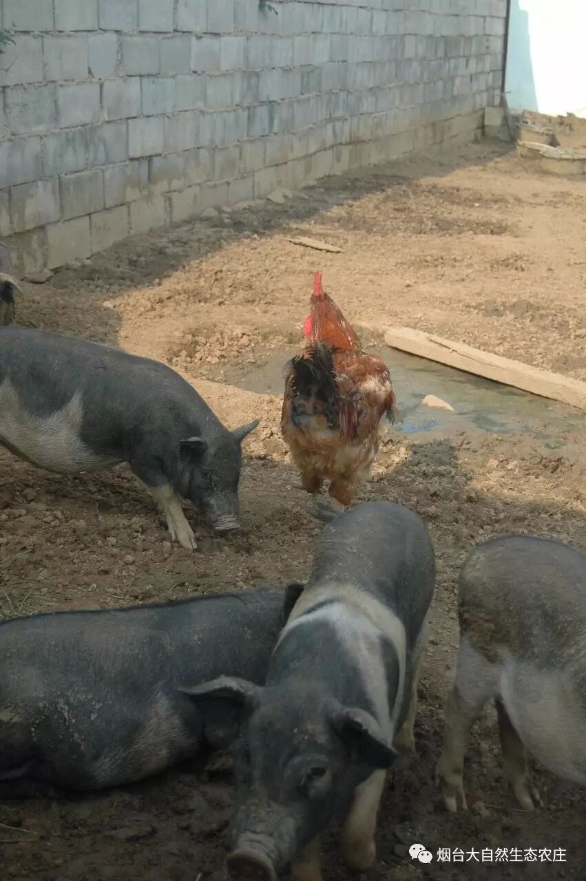 这个大猪是所有猪的老祖宗,种猪,脾气不太好,这俩公鸡胆子也是够大的敢跟种猪一起玩。