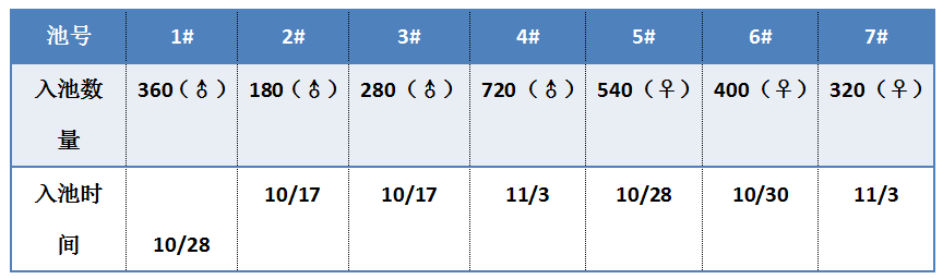 因种虾用地笼从外池捕回,每次捕捞量不同,所以每个越冬池放养量不同。捕捞回的公母虾分开暂养,具体放养情况见表1。