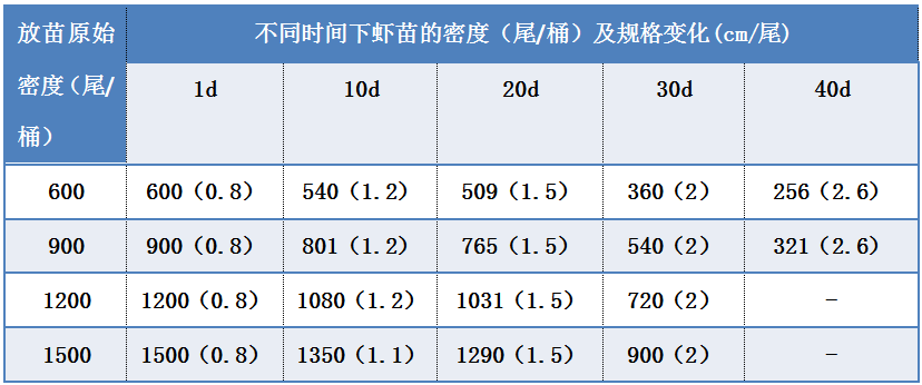 育苗过程中,我们在四个直径1.9m的玻璃缸桶中投放不同密度的虾苗(分别为600尾/桶、900尾/桶、1200尾/桶、1500尾/桶),玻璃缸桶采用为流水养殖方式,水温控制在24-26℃之间。投喂仔虾开口料,培育过程中每间隔十天对虾规格测量一次并估算虾数量。不同密度下苗种培育的具体情况见表3。