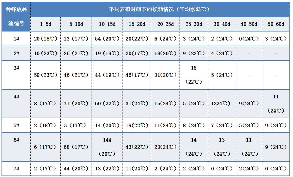 注:越冬过程中由于前一个月水温变化情况大,所以5天记录一次,后一个月水温情况及虾损耗情况相对稳定,所以10天记录一次。