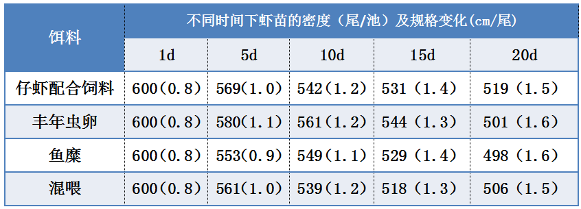 从表5可看出,不同类型的饵料对1-20d内的虾苗成活率影响并不大,虾苗在前20d的时候因其规格较小,活动及摄食能力较差,因此在饵料粒径大小上有较高要求,适宜投喂仔虾配合饲料、丰年虫卵等,鱼糜因操作费时,可少喂或不喂。