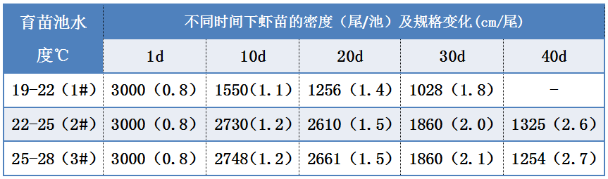 育苗过程中,靠温棚出口的1#池温度较低,为19-22℃,靠温棚中间位置的2#、3#号池,温度较高,分别为22-25℃、25-28℃。培育过程中每隔十天对虾规格测量一次并估算虾数量。不同温度下苗种培育的具体情况见表4。