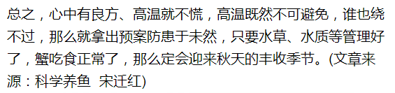 今年入伏是7月12号,出伏8月22号,高温时间将持续40天,目前已经到了一年中最热的时候。对于河蟹养殖来说,管好一池水、养好一池草,顺过渡过这一年中温度最高的时间,将为河蟹丰产丰收打下坚实的基础。