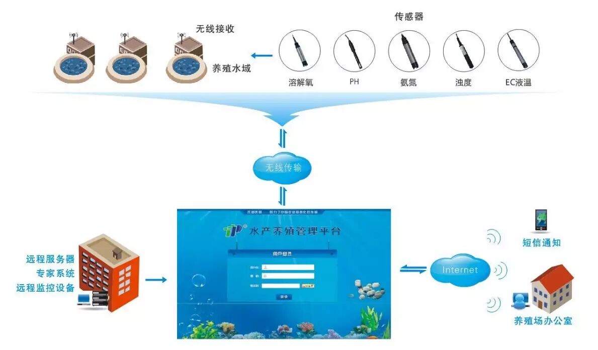 托普农业物联网集成智能水质传感器、无线传感网、无线通信、智能管理系统和视频监控系统等专业技术,对养殖环境、水质、鱼类生长状况等进行全方位监测管理,达到省电、增产增收的目标。