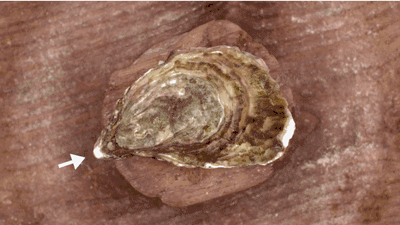 2、刀尖快速划向侧边,撬开,动作要快,使生蚝肉上没有碎壳粘连;
