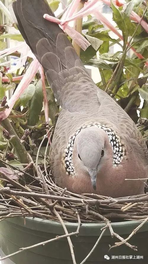 去年3月23日,那天她正与一群朋友在台湾旅游,收到老公发来的微信,是一张鸟的照片,灰褐色的羽毛,脖颈上还有一圈白点,非常漂亮。老公说,这对鸟在阳台窗外一盆紫菜苔里筑了巢,还生了两只蛋。