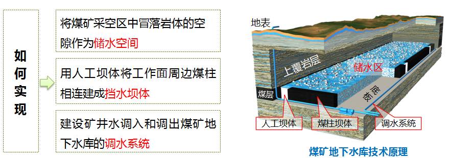 曾经,地下水的破坏是煤炭开采带来的主要问题,我国目前每年产生矿井水80亿吨,利用率仅25%,年损失量60亿吨,相当于我国每年工业和民用缺水量的60%。神华集团“煤炭开采水资源保护与利用”国家重点实验室经过20年的研究解决了矿井水的保护利用问题,他们采取“导储用”的方法将含水层的地下水疏导至采空区进行储存,并建设相应的水处理和抽采利用工程,对矿井水进行高效利用。图为矿井水地下水库原理