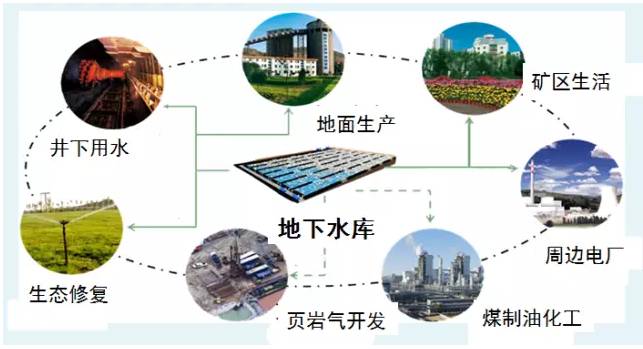 煤炭开采的过程中产生的矿井水不仅不会排到地表造成污染,而是存在井下供井下使用,还供给地面的生产、生活和生态使用。图为基于地下水库的矿井水利用途径