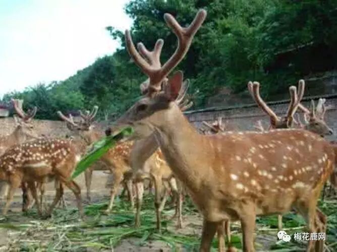 2、饲料条件:梅花鹿完全圈养的每年每只平均需要精饲料350~400公斤,需要粗饲料1750~2000公斤,因此要求一年四季牧草繁茂。
