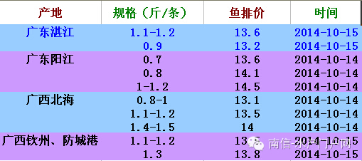 与往年比较,今年金鲳鱼呈分散和错峰上市的特点比较明显。由于早在6月底,在市场需求旺盛、价格利好刺激下(鱼价同比上升2-3元/斤),除海南外,两广地区春投4-5两/条规格的金鲳鱼就开始陆续上市。7月份受超强台风“威马逊”打击后,华南地区金鲳鱼养殖量减少了一半以上。在台风“海鸥”前夕,养殖户恐慌出鱼,鱼价出现短暂下跌,9月底为一年一度华南地区金鲳鱼上市的高峰期,当时湛江、北海金鲳鱼1斤和1.2斤规格排价迅速回升至13.5元/斤和14元/斤,国庆节间,在节日消费节日效应的拉动下,鱼价继续被推高,平均上升4-5毛/斤。节后,因鱼儿减料和厂家催料,广东阳江、湛江,广西北海、钦州、防城港各港区每天金鲳鱼出排源源不断。受出鱼量猛增影响,近日来两广地区的鱼排价格与国庆节黄金周期间相比,平均每斤下降4-5毛,至归9月底时的价格。