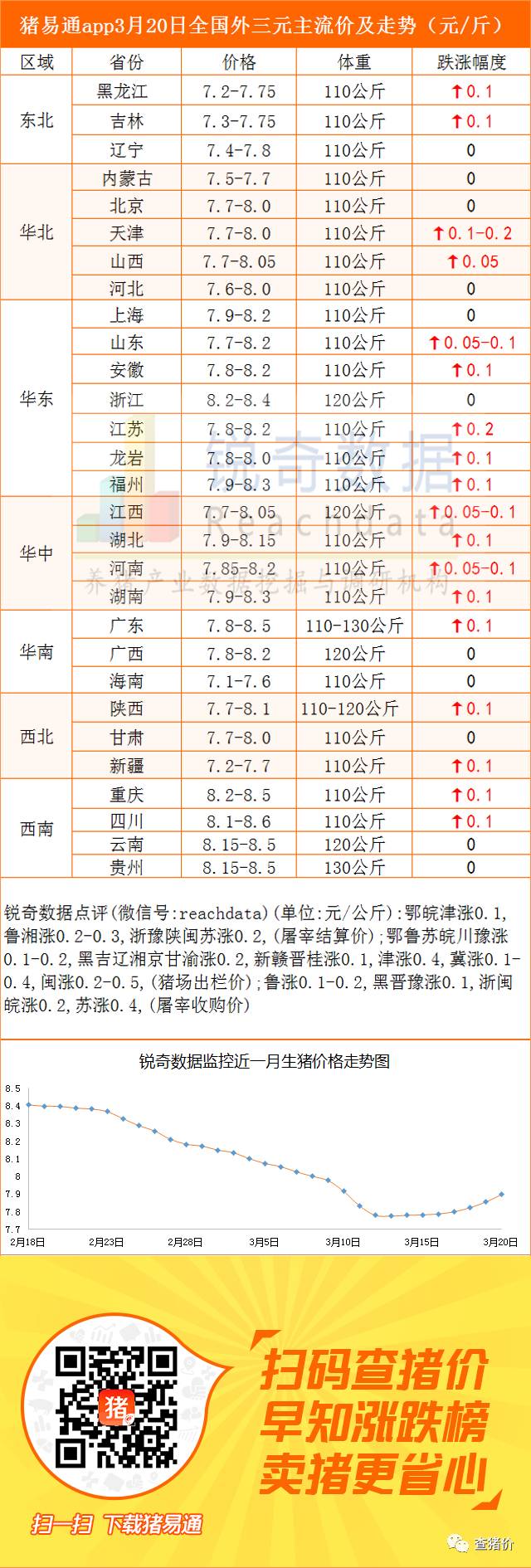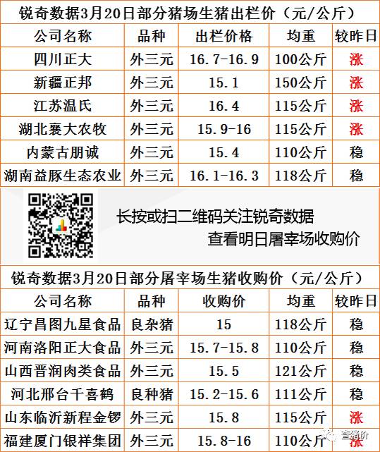 1、今日山东地区猪价上涨。2、山东地区屠宰企业品种猪收购价上涨,烟台、青岛地区屠宰企业品种猪收购价上涨0.05元/斤,临沂地区屠宰企业品种猪收购价上涨0.2元/斤,威海地区屠宰企业品种猪收购价稳定,潍坊地区屠宰企业品种猪收购价上涨0.05-0.15元/斤,山东地区屠宰企业品种猪收购价在7.8-8.0元/斤。3、猪场出栏价格上涨,猪场主流出栏价在7.7-8.1元/斤,养殖户惜售情况严重,屠企采购较为紧张。