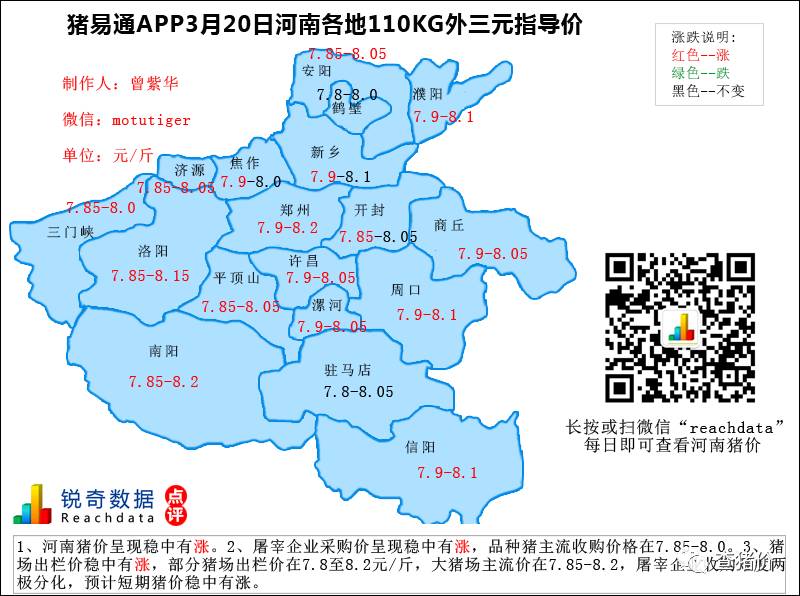 1、河南地区猪价呈现稳中有涨。2、河南地区屠宰企业品种猪采购价呈现稳中有涨,品种猪主流收购价格在7.85-8.0元/斤。3、猪场出栏价稳中有涨,部分猪场出栏价在7.8至8.2元/斤,大猪场主流价在7.85-8.2元/斤,屠宰企业收购难度两极分化,预计短期猪价稳中有涨。