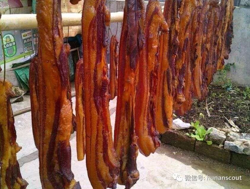 腊肉用柏枝熏制,故夏季蚊蝇不爬,经三伏而不变质,成为别具一格的地方风味食品,湘西腊肉,亦称三湘腊肉,是选用皮薄、肉嫩、体重适宜的宁香猪为原料,经切条、配制辅料,腌渍、洗盐、晾干和熏制六道工序加工而成,其特点是皮色红黄、脂肪似腊、肌肉棕红、咸淡适口、熏香浓郁、食之不腻