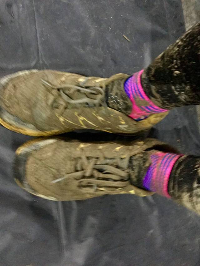 WS8出来我继续采取跟随战术,紧跟两个马来仔。WS8到WS9全程在海拔1800左右的神山半山腰巨型菜园里面兜一个圈,为防止作弊,中途有个CP1打卡。这段难度不算大,最虐的同样是泥巴路,菜地之间的泥路被大部队踩过后变成“和稀泥”,深一脚、浅一脚,我前面的马来仔多次掉进坑里,我的WS6刚换的HOKA也变得面目全非。过了CP1打卡,后面是碎石机耕路返回WS9。