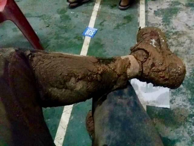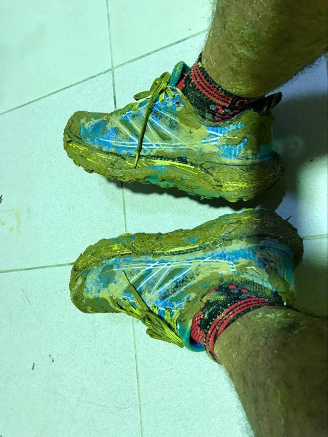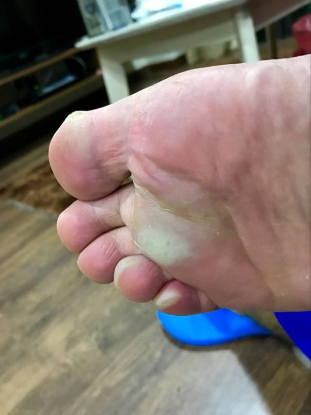 比赛结束立刻换上从QP那里购买的台湾神拖,双侧脚底水泡触目惊心,双脚长时间水泡肿胀,穿上神拖缓解不少。