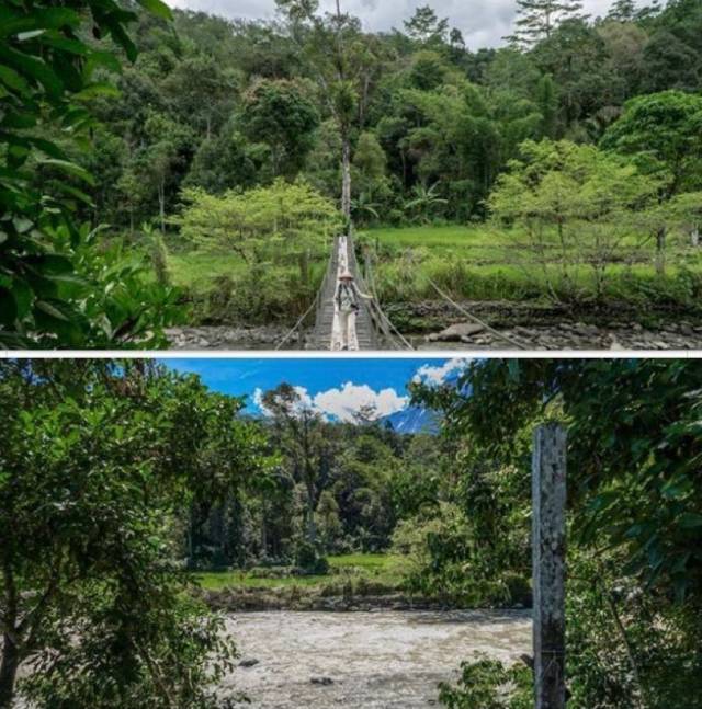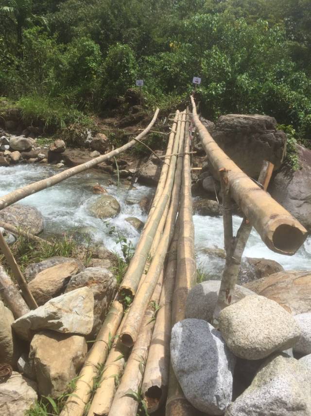 下到山脚是村庄,有村民售卖水饮料和简单食物,穿过村庄就是简陋的吊桥,上桥要管制,桥身只能承受大约五人,上了吊桥发现共振很厉害必须紧握绳索。